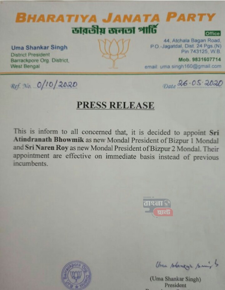 দায়িত্ব থেকে সরানো হলো বীজপুরে বিজেপির দুই মন্ডল...