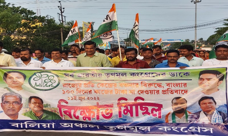 কেন্দ্রীয় সরকার ১০০ দিনের কাজের প্রকল্পের টাকা দিচ্ছে না। বার বার নিজের হকের টাকার চেয়েও টাকা পায়নি বাংলা। এদিকে ১০০ দিনের কাজের টাকা না পাওয়ার ফলে বাংলার বিভিন্ন জেলায় ১০০ দিনের কাজ বাকি পড়ে রয়েছে। কেন্দ্র উদ্দেশ্য প্রণোদিতভাবে বাংলাকে বঞ্চনা করছে। তাই কেন্দ্রের এই বঞ্চনার প্রতিবাদে রাস্তায় নেমেছে তৃণমূল। কেন্দ্রের এই বঞ্চনার কারণে তৃণমূলের পক্ষ থেকে রাজ্যব্যাপী প্রতিবাদ বিক্ষোভ কর্মসূচি করা হচ্ছে।শনিবার বিকেলে বালিয়া অঞ্চল তৃণমূল কংগ্রেসের পক্ষ থেকে এই প্রতিবাদ বিক্ষোভ কর্মসূচি অনুষ্ঠিত হয়। এদিন খড়সা তিন মাথা মোড় শহীদ ক্ষুদিরাম বসুর মূর্তির সামনে থেকে শুরু হয় এই মিছিল। এদিনের মিছিলের নেতৃত্ব দেন মুর্শিদাবাদ জেলা প্রাথমিক বিদ্যালয় সংসদের সভাপতি ও খড়গ্রাম বিধানসভার বিধায়ক আশীষ মার্জিত ও বালিয়া গ্রাম পঞ্চায়েতের প্রধান গোকুল ঘোষ,কান্দী পঞ্চায়েত সমিতির কৃষি কর্মাধ্যক্ষ গৌরব চট্টোপাধ্যায়, খড়গ্রাম পঞ্চায়েত সমিতির কৃষি কর্মাধ্যক্ষ সুপ্রিয় ঘোষ, বিশিষ্ট সমাজসেবী শাশ্বত মুখার্জী, বালিয়া গ্রাম পঞ্চায়েতের সমস্ত সদস্য ও সদস্যারা, মহিলা তৃণমূল কংগ্রেস সহ অন্যান্য তৃণমূল নেতৃত্বরা। তৃণমূলের পক্ষ থেকে সাফ জানানো হয়েছে অবিলম্বে কেন্দ্র বাংলার হকের টাকা না দিলে আগামী দিনে তারা আরও বড় আন্দোলনে নামবেন।