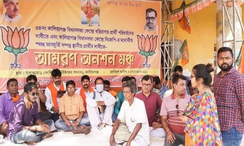 এদিকে প্রার্থী বদলের দাবিতে কালিয়াগঞ্জে বিজেপি কর্মী সমর্থকেরা যখন আমরণ অনশন শুরু করছেন তখন ঘোষিত বিজেপি প্রার্থী রায়গঞ্জে এক সাংবাদিক সম্মেলন করে জানালেন আগামীকাল থেকে দলের জেলা শীর্ষ নেতৃত্ব এবং কর্মী সমর্থকদের নিয়ে কালিয়াগঞ্জ বিধানসভায় প্রচার শুরু করবেন।