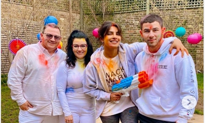 বাংলা হান্ট ডেক্স ; স্বামী নিক জোনাস, ও তার শ্বশুর-শাশুড়িকে নিয়েই রঙের খেলায় মাতলেন বলিউডের দেশি গার্ল। লন্ডনেই পরিবারের সাথে হোলি (Holi) খেলেছেন। এরপর নিজেদের হোলি খেলার ছবি শেয়ার করে নিয়েছেন সোশ্যাল মিডিয়াতে। ছবিতে শুরুতেই একেবারে ফ্যামিলি ফটো দেখতে পাওয়া যাচ্ছে। যেখানে শ্বশুর শাশুড়ি, প্রিয়াঙ্কা ও নিককে দেখা যাচ্ছে। প্রিয়াঙ্কার হাতে রয়েছে একটি পিচকারি যেটা নিকের দিকেই তাক করে রাখা রয়েছে।
