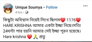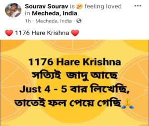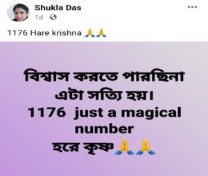 সোশ্যাল মিডিয়ায় বিশেষ করে ফেসবুকে এই ‘১১৭৬ হরে কৃষ্ণ’ (1176 Hare Krishna) এখন দারুণভাবে ভাইরাল ৷ ১০ জনের মধ্যে ৮ জনই নিজেদের ওয়ালে এই পোস্ট করছেন ৷ অনেকে এটা নিয়ে হাসি-ঠাট্টাও করছেন ৷ অনেকে মজা করে অনেক মন্তব্যই করছেন ৷ অনেকে আবার সিরিয়াসও ৷ এই নম্বর লিখলে নিজের মনঃস্কামনা নাকি পূরণ হবেই ৷ এমনটাই বিশ্বাস অনেক মানুষের ৷