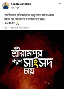 সুতরাং দলের অন্দরে খেলা জমে গিয়েছে বলে মনে করা হচ্ছে। দেখা গিয়েছে, ‘শ্রীরামপুর নতুন সাংসদ চায়’ মর্মে একটি পোস্টার টুইট করা হয়েছে। আর লেখা হয়েছে, ‘নিজেকে হাস্যস্পদ না করে আপনার চারদিকে যে পরিবর্তন ঘটছে, তাকে সসম্মানে মেনে নিন।’