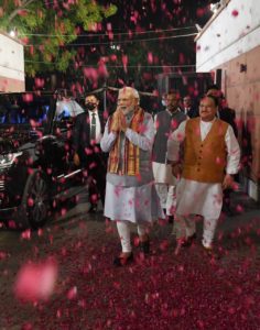 নিউজ ডেক্সঃ বাংলায় হারের পর থেকেই কিছুটা ম্লান হয়েছিল ‘ছাপান্ন ইঞ্চি’-র দাপট। প্রশ্ন উঠছিল, এ বার কি তা হলে আর কাজে আসছে না মোদী-ম্যাজিক? বিজেপি-র দিক থেকে মুখ ফিরিয়ে নিচ্ছে ‘আচ্ছে দিন’ দেখার আশায় ভোট দেওয়া জনগণ? তবে বৃহস্পতিবার বিকেল থেকেই আবার ‘মোদী-দাপট’ দেখতে শুরু দেখল দেশবাসী। চার রাজ্যে (গোয়া এখনও ত্রিশঙ্কু) বিজেপি বিধানসভা দখলের পর বৃহস্পতিবার সন্ধ্যাবেলা নয়াদিল্লির সদর দফতর থেকে হুঙ্কার দিতে দেখা যায় প্রধানমন্ত্রী নরেন্দ্র মোদীকে। বলতে শোনা গিয়েছে, ২০২৪ সালে বিজেপি-র ক্ষমতায় আসা আটকানো যাবে না। পাঁচ রাজ্যে বিধানসভা নির্বাচের ফল প্রকাশের পরের দিন, অর্থাৎ শুক্রবার বেলা গড়াতে না গড়াতেই গুজরাতের আমদাবাদে দলের নেতা-কর্মীদের সঙ্গে নিয়ে রোড শোতে যোগ দিলেন মোদী। বিমান বন্দর থেকে শুরু হয়, এই রোড শো। কামালাম পর্যন্ত ১০ কিলোমিটার রাস্তা ধরে চলে এই শভাযাত্রা। রোড শো উপলক্ষে প্রচুর সংখ্যক মানুষ এতে অংশ নেন।